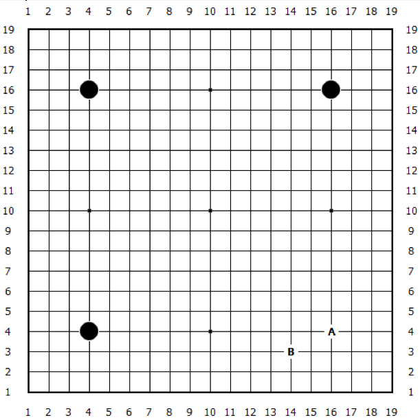 为方便起见,我们把这些行列按顺序编号为 1 \sim 19 ,并用 (x, y) 表示第 x 列第 y 行的位置。例如下图中,A 用 (16,4) 表示,B 用 (14, 3) 表示。