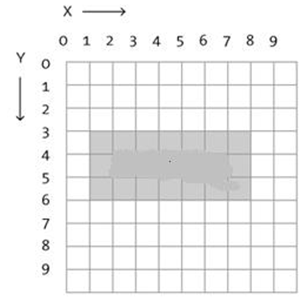 图中灰色部分为长方形的书,它的四个顶点的位置为:左上角位置为(1,3),即在第1列每3行的交叉点上; 右上角位置为(8,3), 即在第8列每3行的交叉点上; 左下角位置为(1,6),即在第1列每6行的交叉点上;右下角位置为(8,6),即在第8列每6行的交叉点上;从图中可以看到此长方形的高度为3,宽度为7,面积为21=3*7。