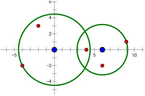 样例2中的导弹拦截系统和导弹所在的位置如下图所示。要拦截所有导弹,在满足最小使用代价的前提下,两套系统工作半径的平方分别为20 和10。