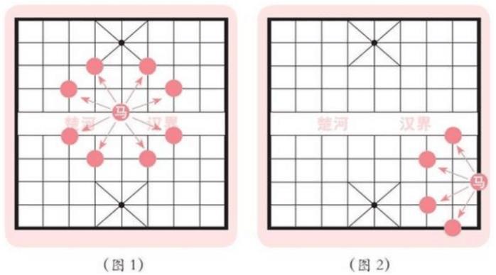 “马走日”的行棋有条规定:马先沿直线走一格,然后再沿斜线走一格。马每次跳一个“日”字,就是从“日”字的一个角走到其对角,不管这个“日”字是立着还是横着,只要没有被蹩住脚,它都可以跳过去。
