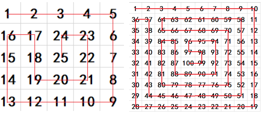 小 X 略加思索便发现了其中的奥妙:把数字从小到大依次填入正方形中,每次填最外面的一圈;每一圈从左上角开始,按照顺时针、逆时针、顺时针……的顺序填。