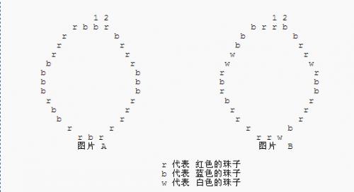 你有一条由 n 个红色的,白色的,或蓝色的珠子组成的项链,珠子是随意安排的。 这里是 n=29 的两个例子: