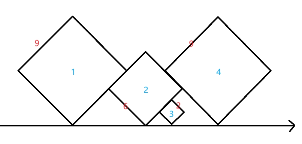 在这片叫做 “正方形” 的景区里,按顺序依次放置了 M 个大小不一的正方形,每个正方形有且仅有一个角与地面有交点,并且呈 45 度角的状态摆放,正方形互相之间没有重叠。在不影响摆放顺序的前提下,会尽可能紧凑的摆放。